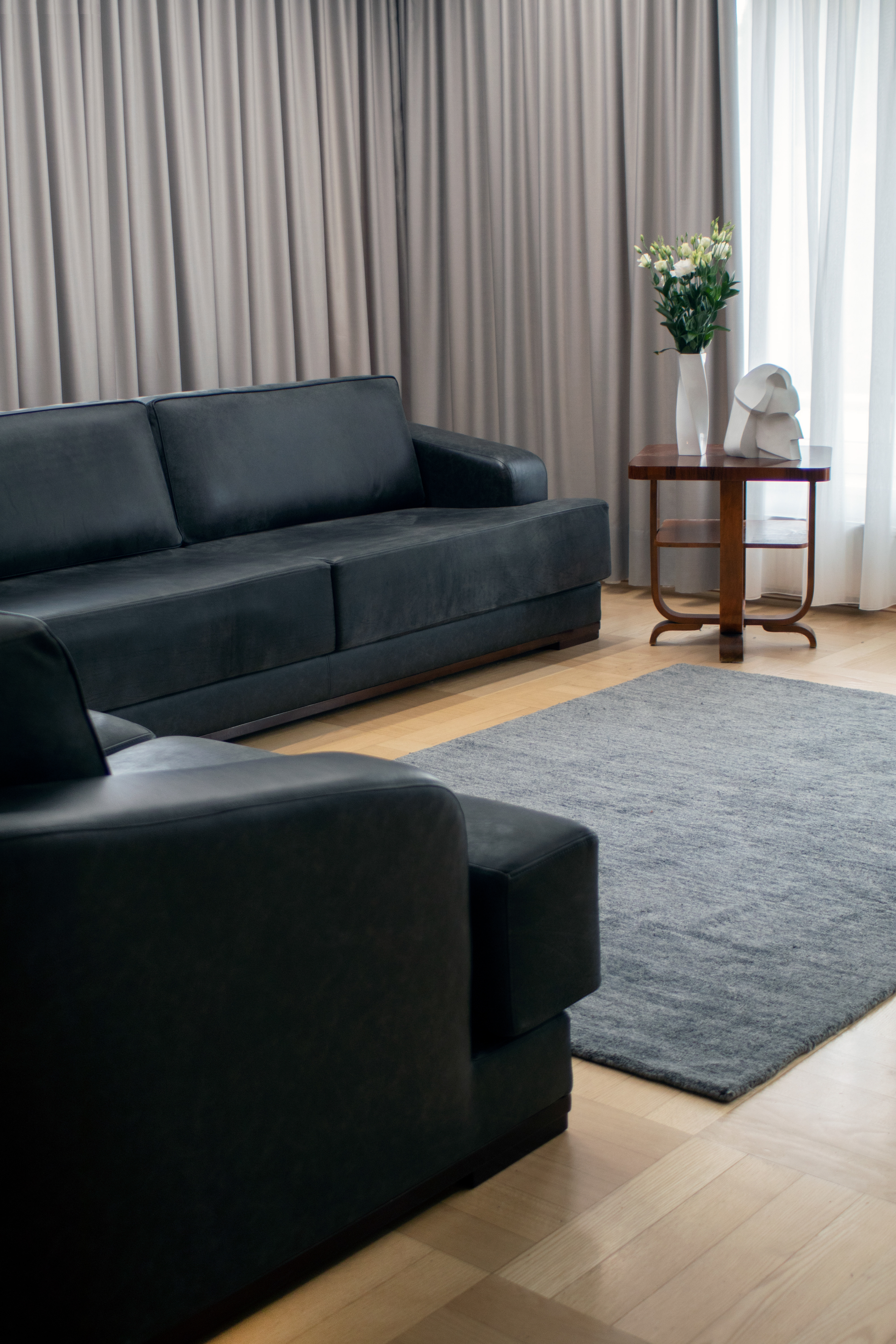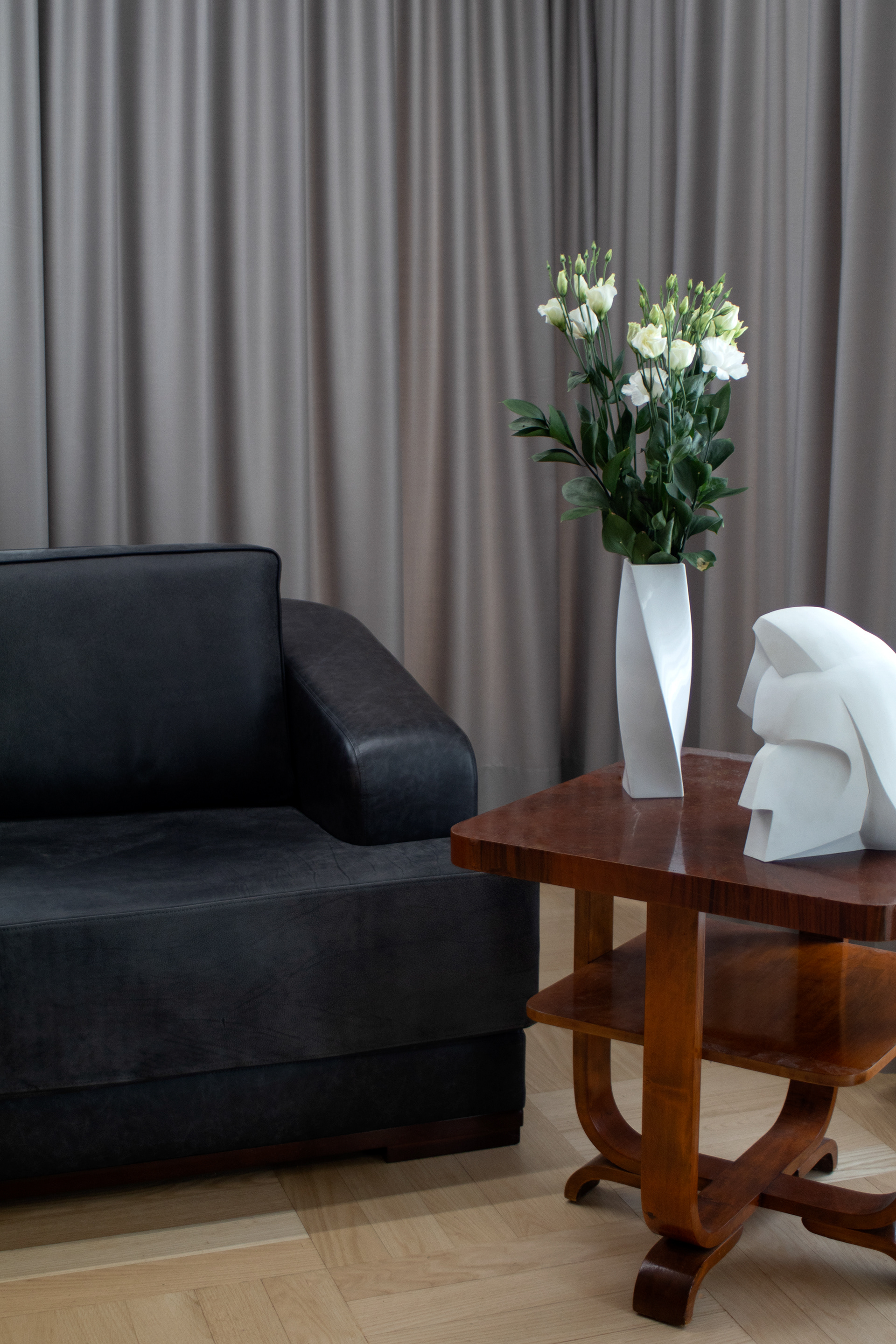 A set of lounge furniture was designed for an individual customer and matched to the existing interior design. The furniture is inspired by the Art Deco style so that it harmonizes with the other original furniture from this era. The sofa has a modern character, but its line goes with the style of the 1920s. It was made of the highest quality materials in the manufacture of upholstered furniture. Departing from the current trend on the market for very low and deep seating furniture, the seats of the set have a very comfortable height suitable also for the elderly and people with disabilities.