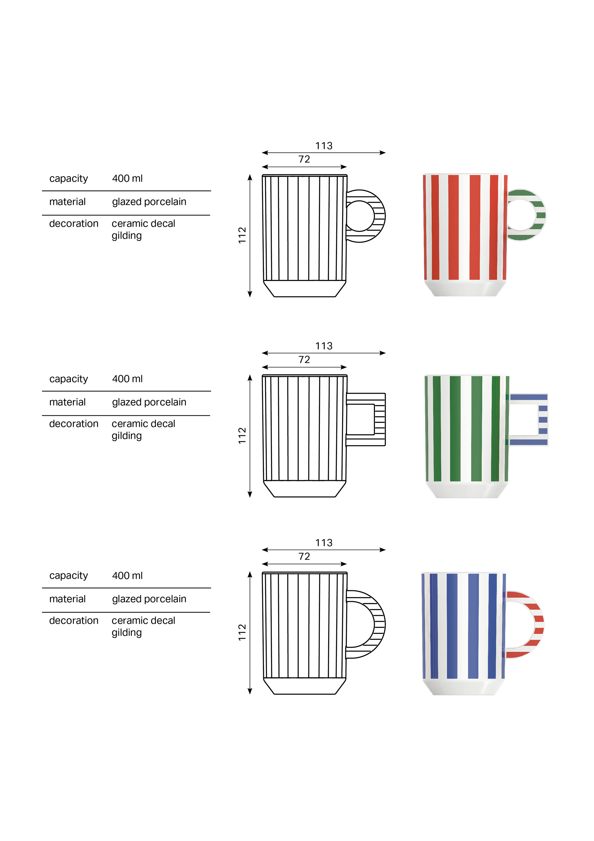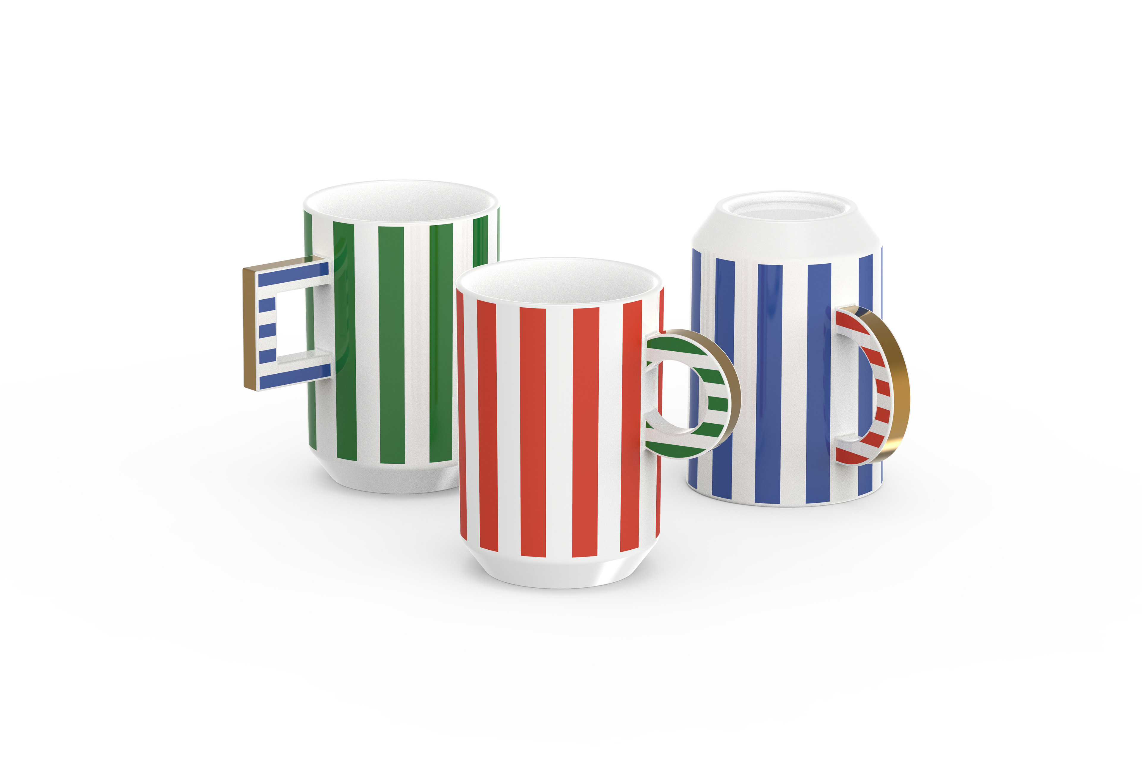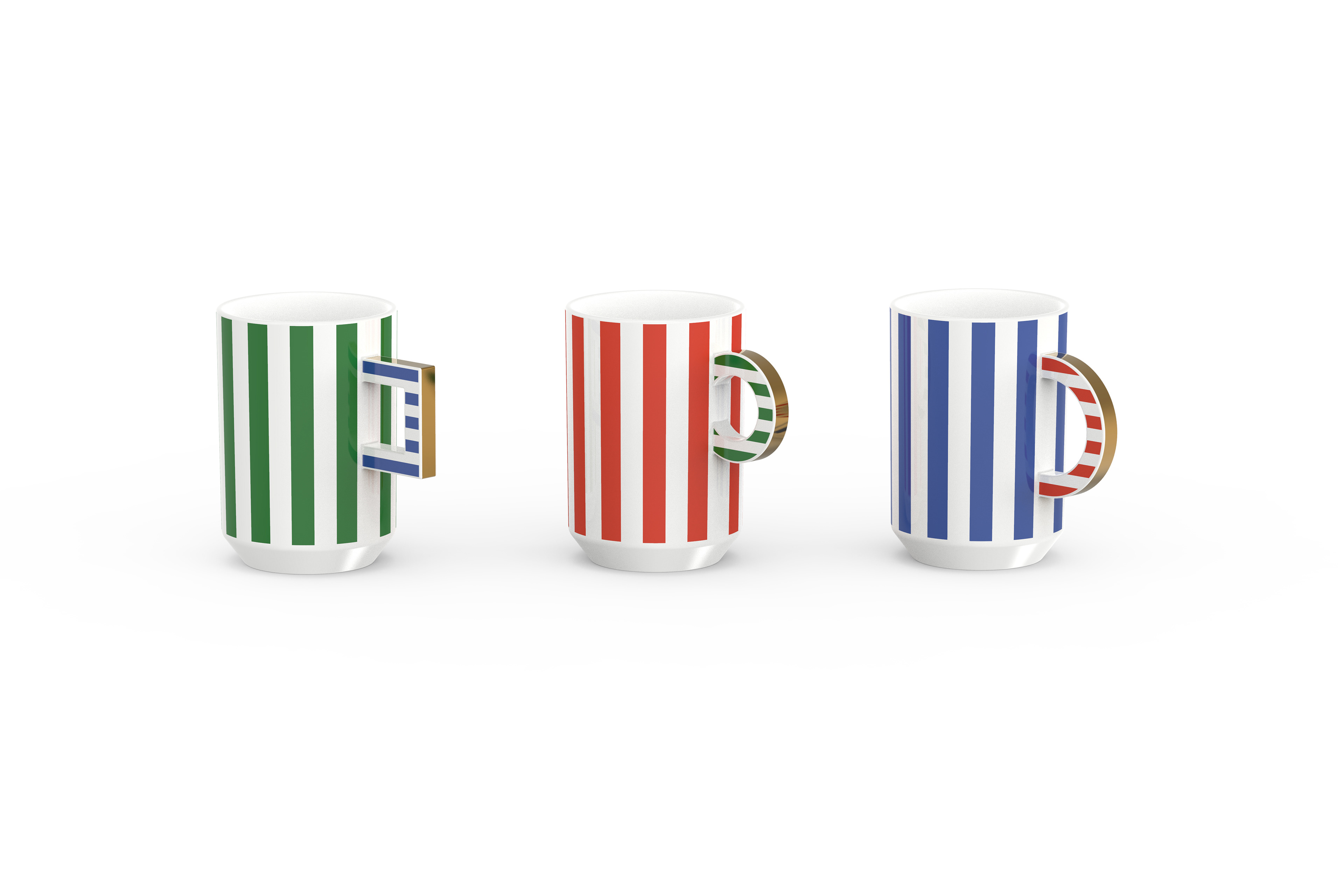 The project refers to the history, culture and traditions of the Aveiro region in Portugal. In the design, the character of the region has been rendered thanks to the use of its characteristic bright colors in the decorating of cups. The main inspiration of the decoration are Palheiros fishing houses, traditionally painted in colorful stripes. Despite the reference to the geographical context, the decoration maintains its universality. The traditional pattern is depicted on the geometric shape of the mug, thanks to which modernity meets tradition in the design. The set is based on the same cup shape and the motif of the belts, but it comes in 3 variants, where the objects differ from each other in the color combination of the belts and the geometric shape of the ear. The whole thanks to these treatments creates a coherent set.