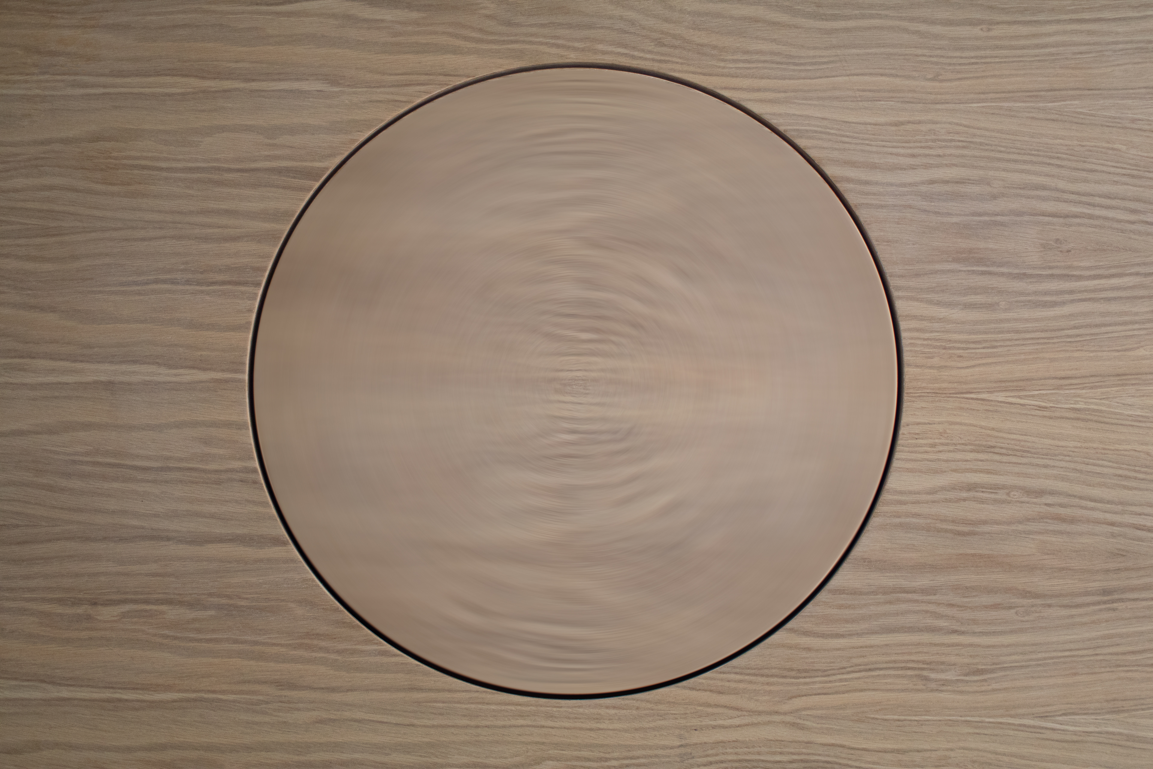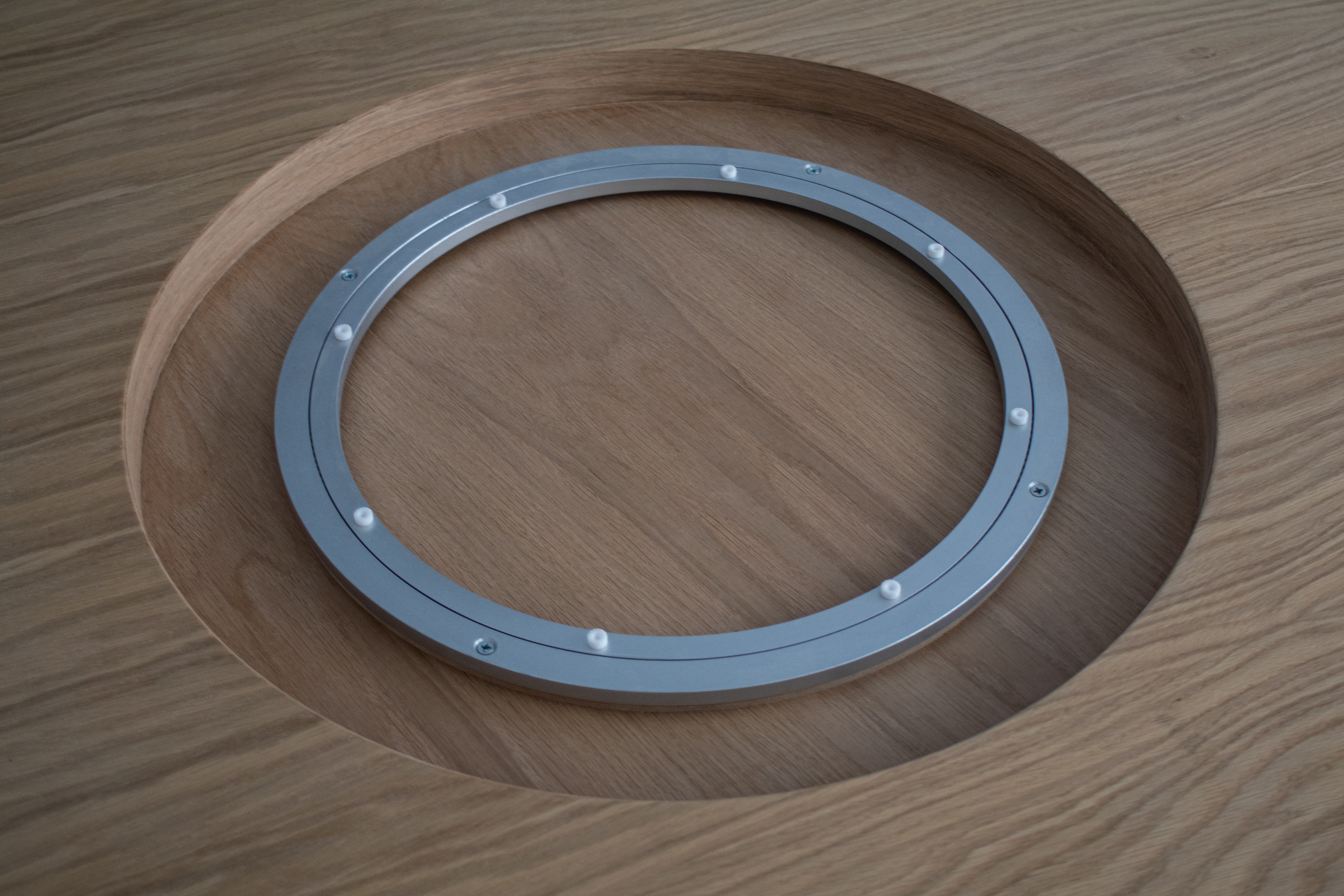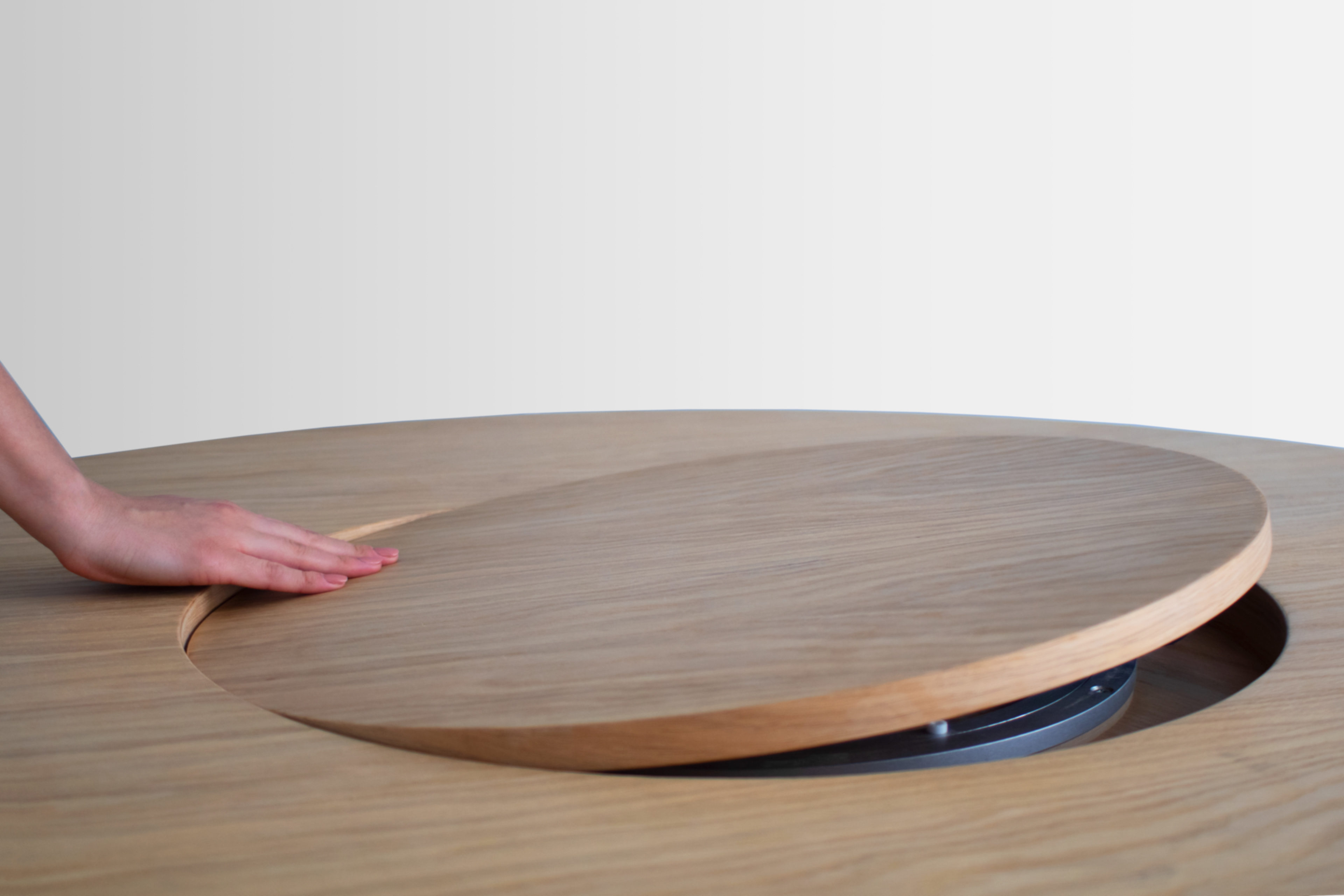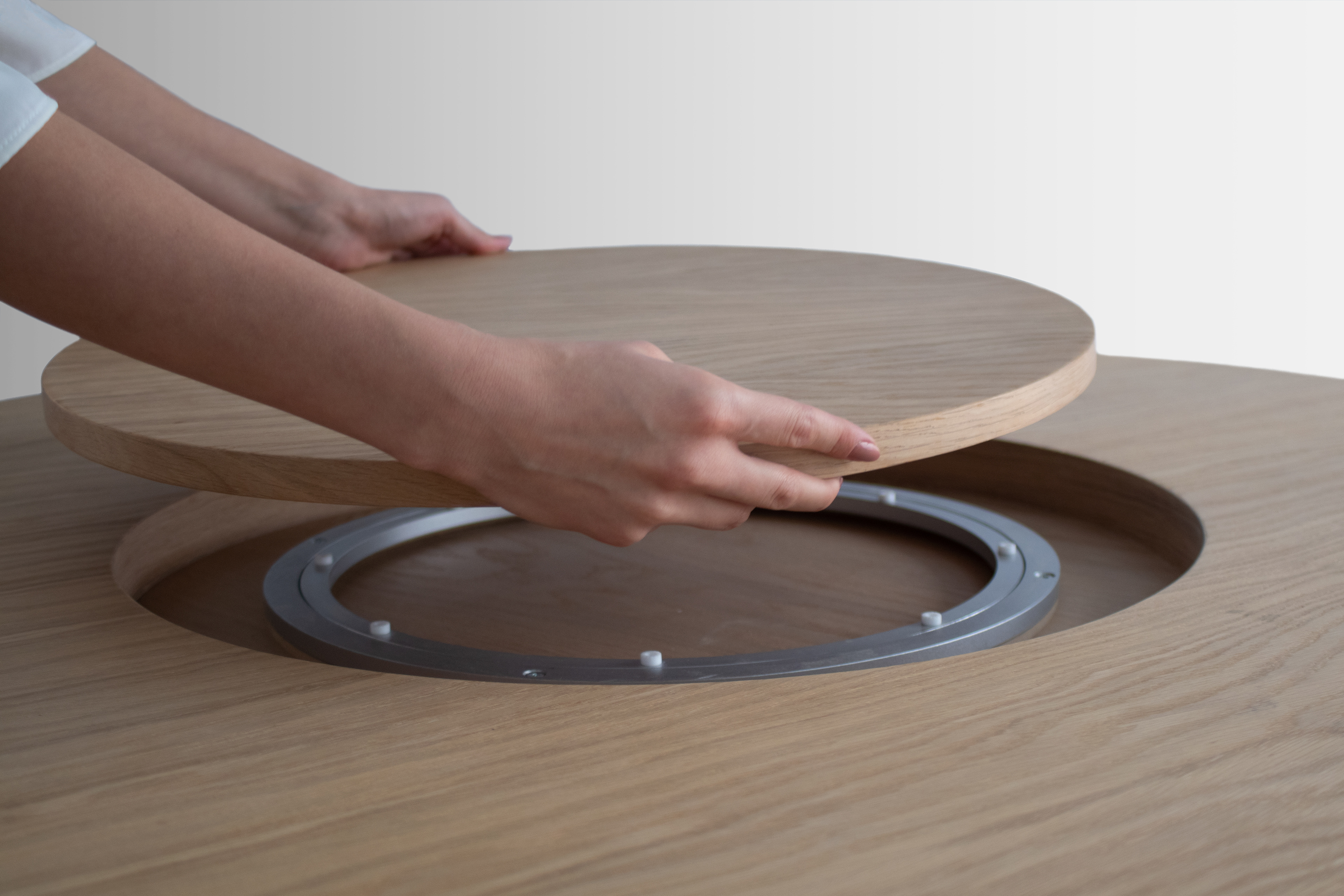 The table with rotating table top is dedicated to both restaurants and private customers. The table top is made of blockboard covered with oak veneer, while the table leg is made of powder-coated steel sheet. The choice of material for the top is to ensure resistance to drying, preventing its smooth rotation, while the leg finish protects it from mechanical damage resulting from use. To facilitate cleaning, the surface of the rotary table top is removable.